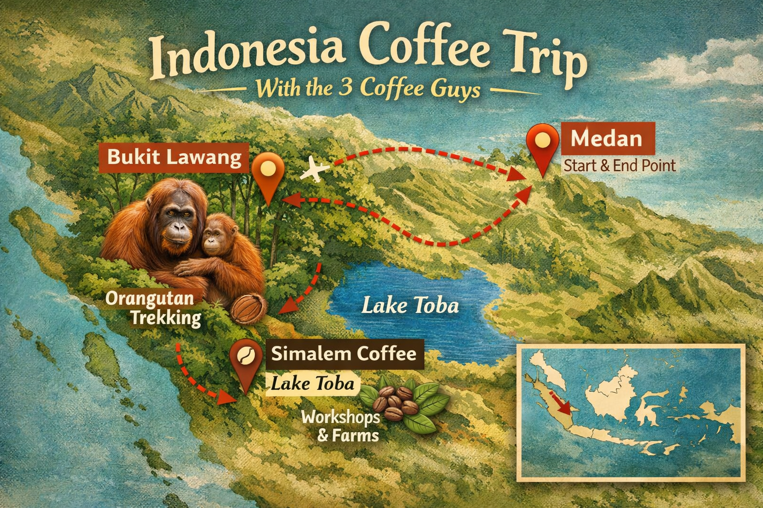 Join the 3 Coffee Guys for an immersive coffee origin experience in North Sumatra, combining hands-on processing workshops, rare farm access, and unforgettable jungle adventure — including orangutans in the wild.